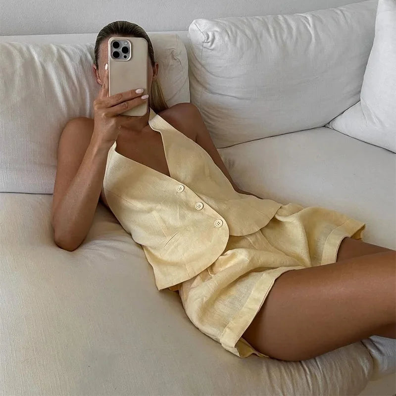 Step into warm-weather elegance with the Soléa Striped Linen Set – a sleek two-piece outfit that pairs a halter-style vest with matching high-waisted shorts. Tailored for summer days and effortless transitions, this set delivers structure, style, and breathable comfort in every stitch.