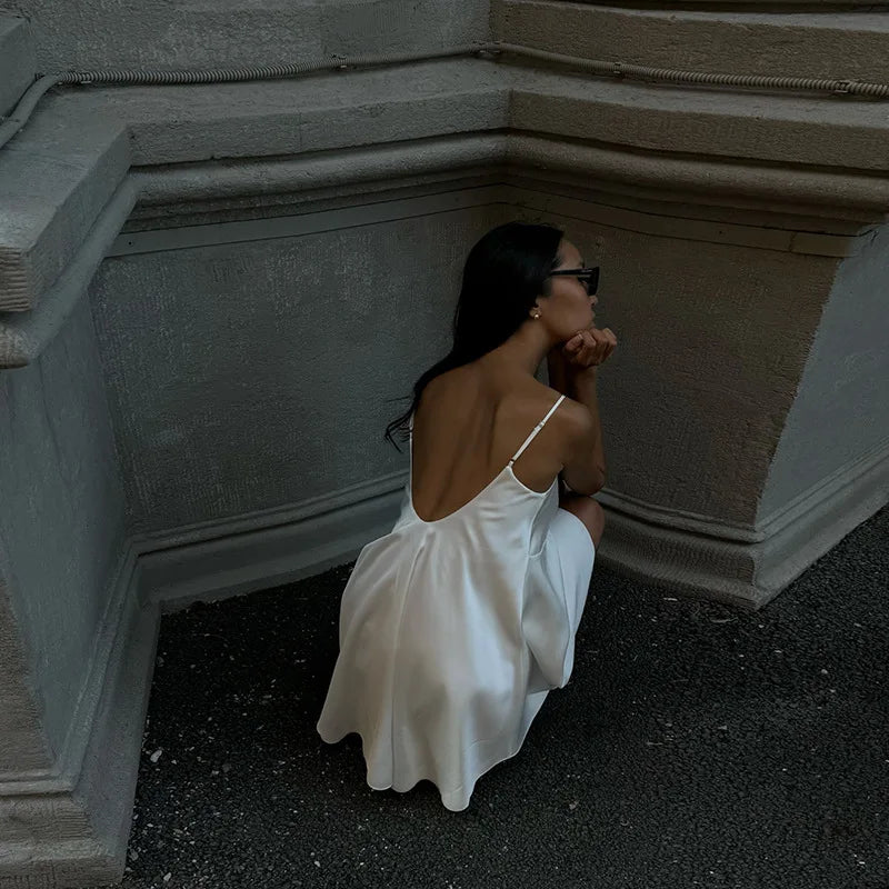 Elegance meets allure in the SilkMuse Backless Satin Dress by DRESS like US – a stunning combination of smooth satin fabric and delicate lace splicing, crafted to make an impression from every angle. With a sleek A-line silhouette, open back detail, and soft white tone, this dress is your go-to for romantic summer nights, bridal events, or elegant dinners.
