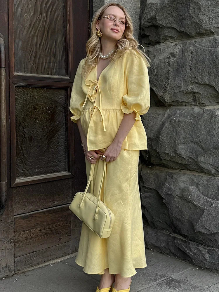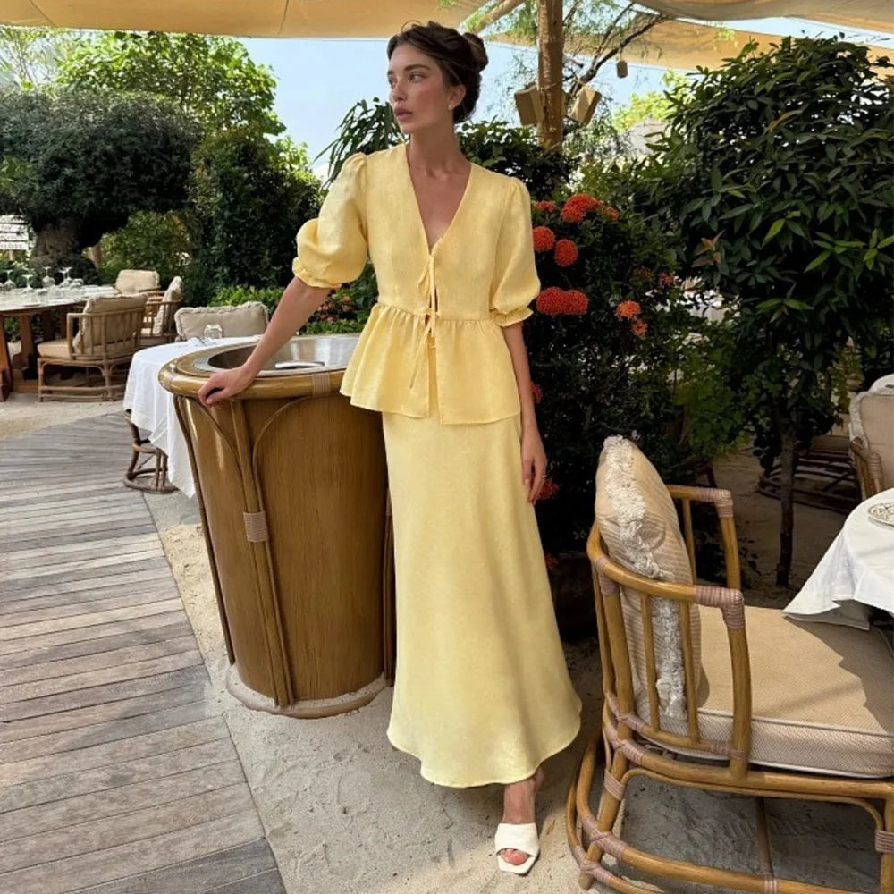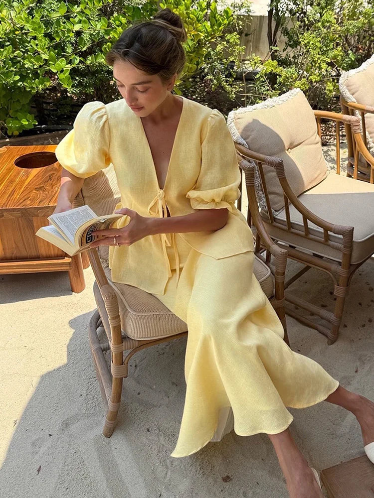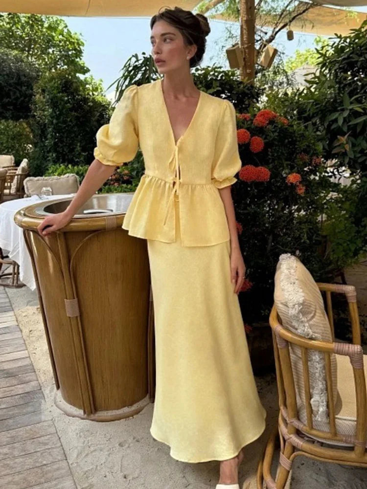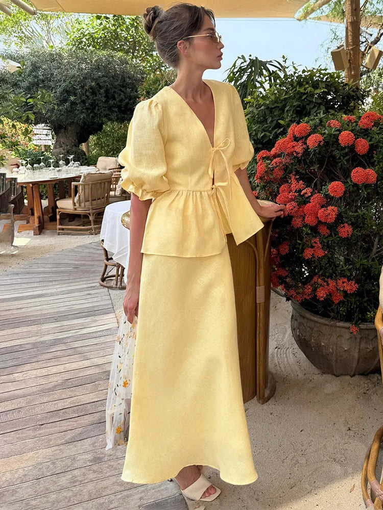 The Trendix Ruffle Skirt Set is a two-piece summer statement designed for sun-soaked days, beach getaways, and vacation ease. With a lace-up v-neck top and flowing ankle-length ruffle skirt, it brings casual grace and femininity to every step.